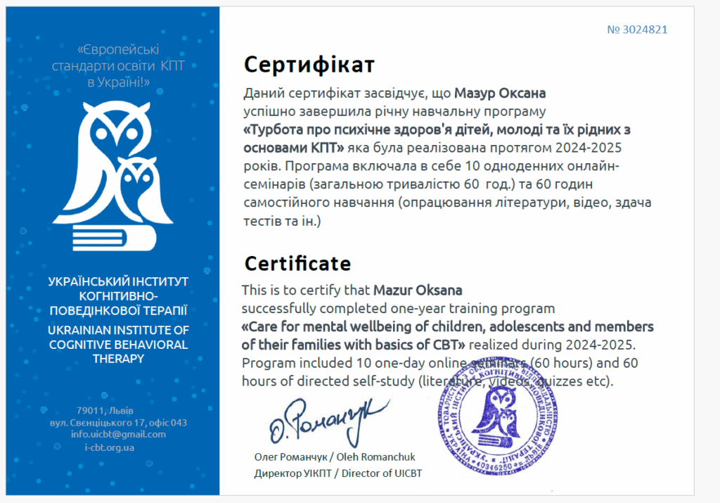 Річна програма “Турбота про психічне здоров’я дітей, молоді та їх рідних з основами КПТ”. КПТ-консультант для дітей, підлітків та їх рідних.